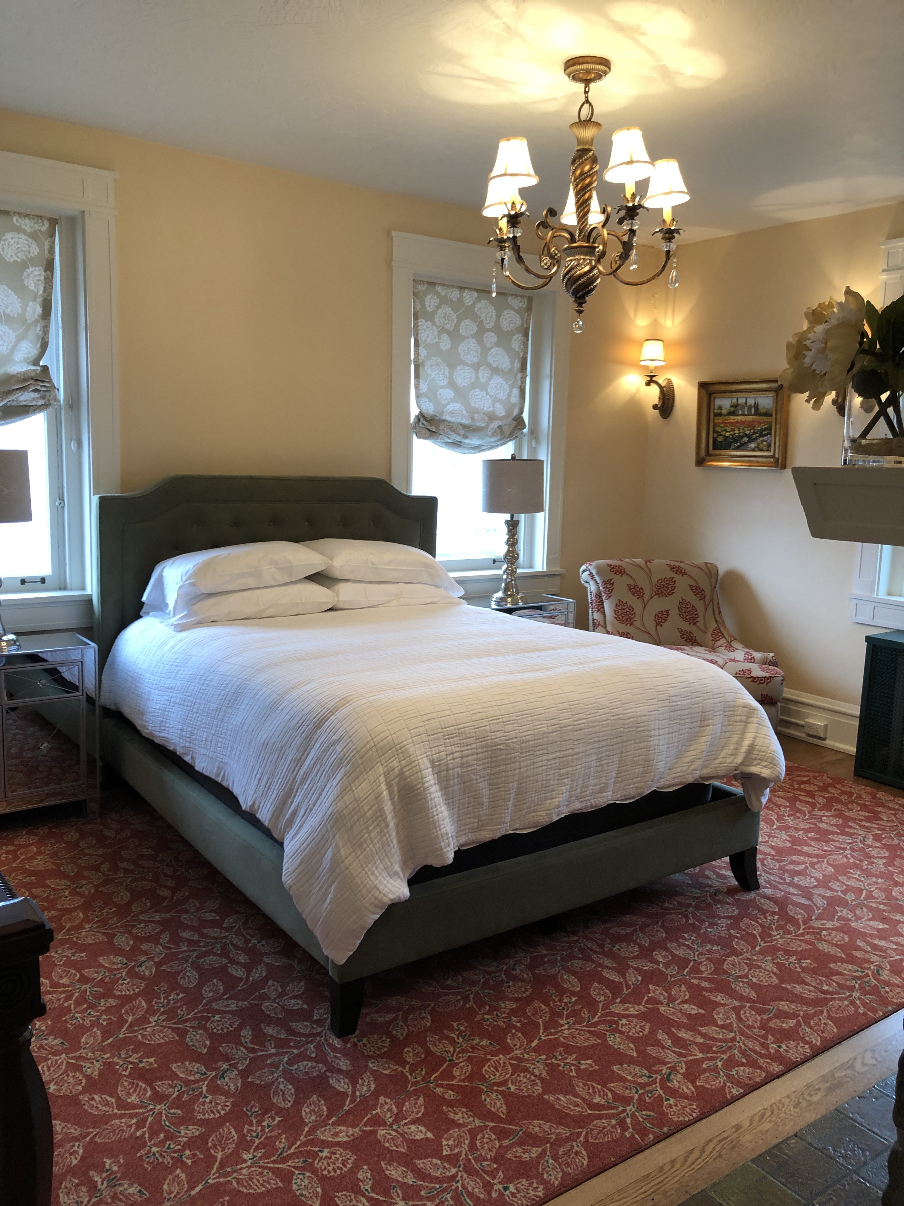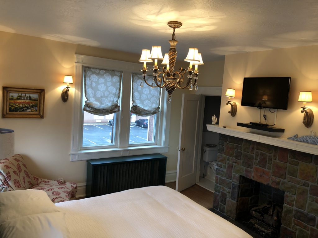 Room 204, is a queen room with windows facing the side and back of the inn. Room 204 is one of three rooms at Thistledown which offers an original, uniquely tiled fireplace. Updated gas logs provide a cozy warmth to the room. There is a full length mirror for quests getting ready for an evening out and a hallway which leads to the bedroom. The bathroom is somewhat smaller but very cozy.