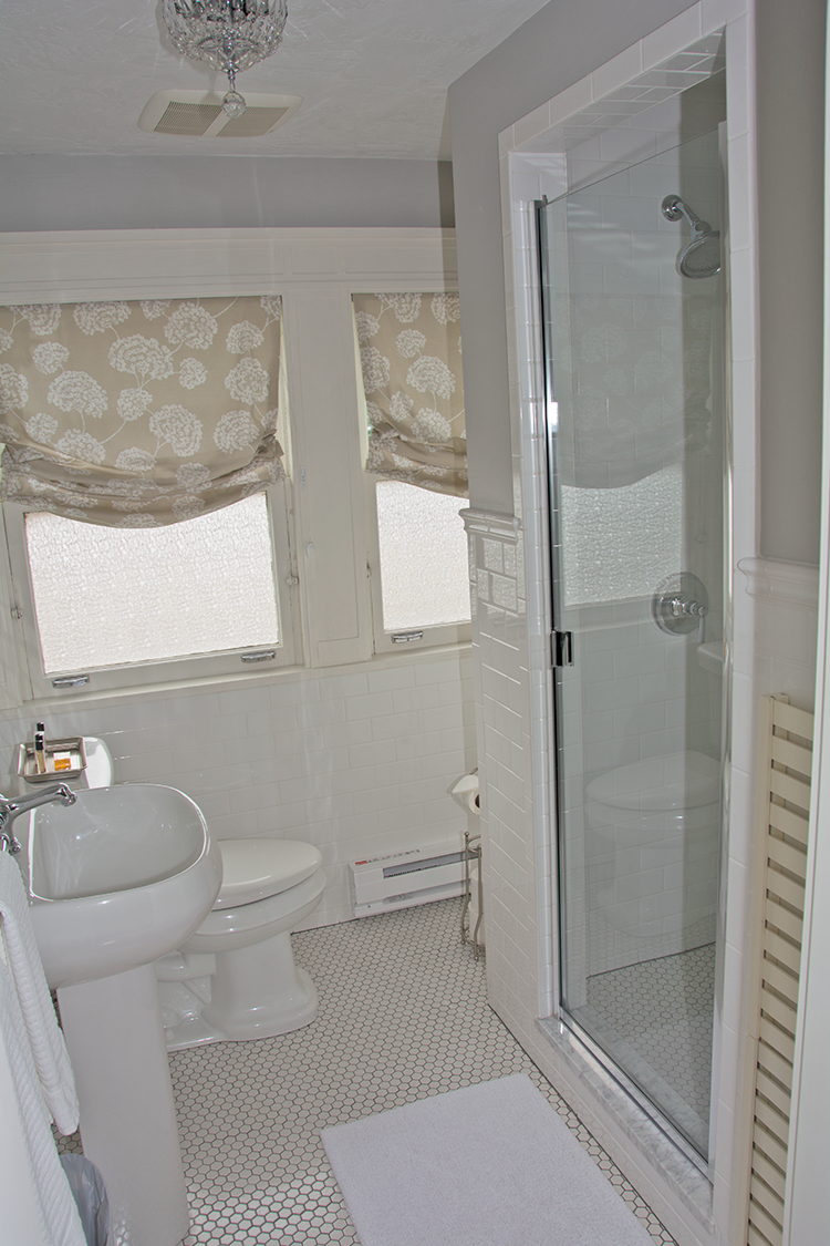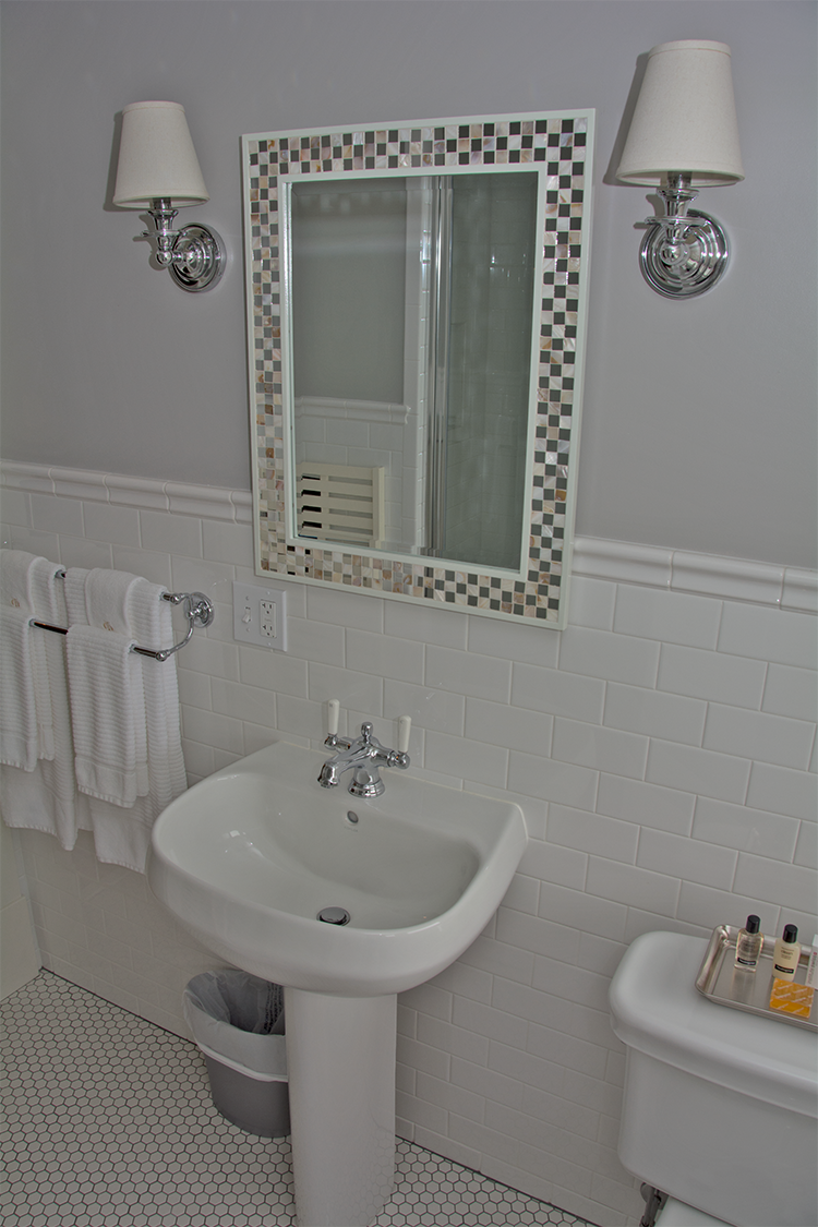 Room 304 is a great, cozy 3rd floor room. The bedroom in is small but uniquely comfortable. Room 303 has a queen bed and a smaller window that casts the night lights gently on the ceiling. The bathroom has beautiful subway tile and a good sized shower. There is also a small sitting room at the entrance of room 304 which has a comfortable recliner and lamp great for a reading or working before bed.