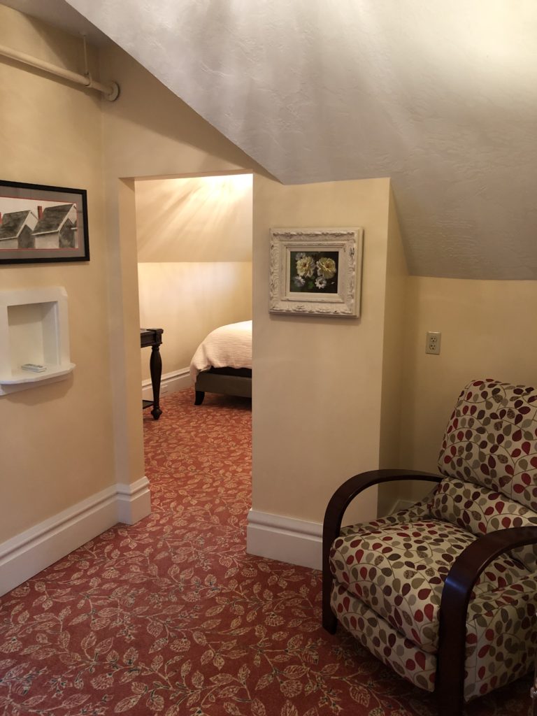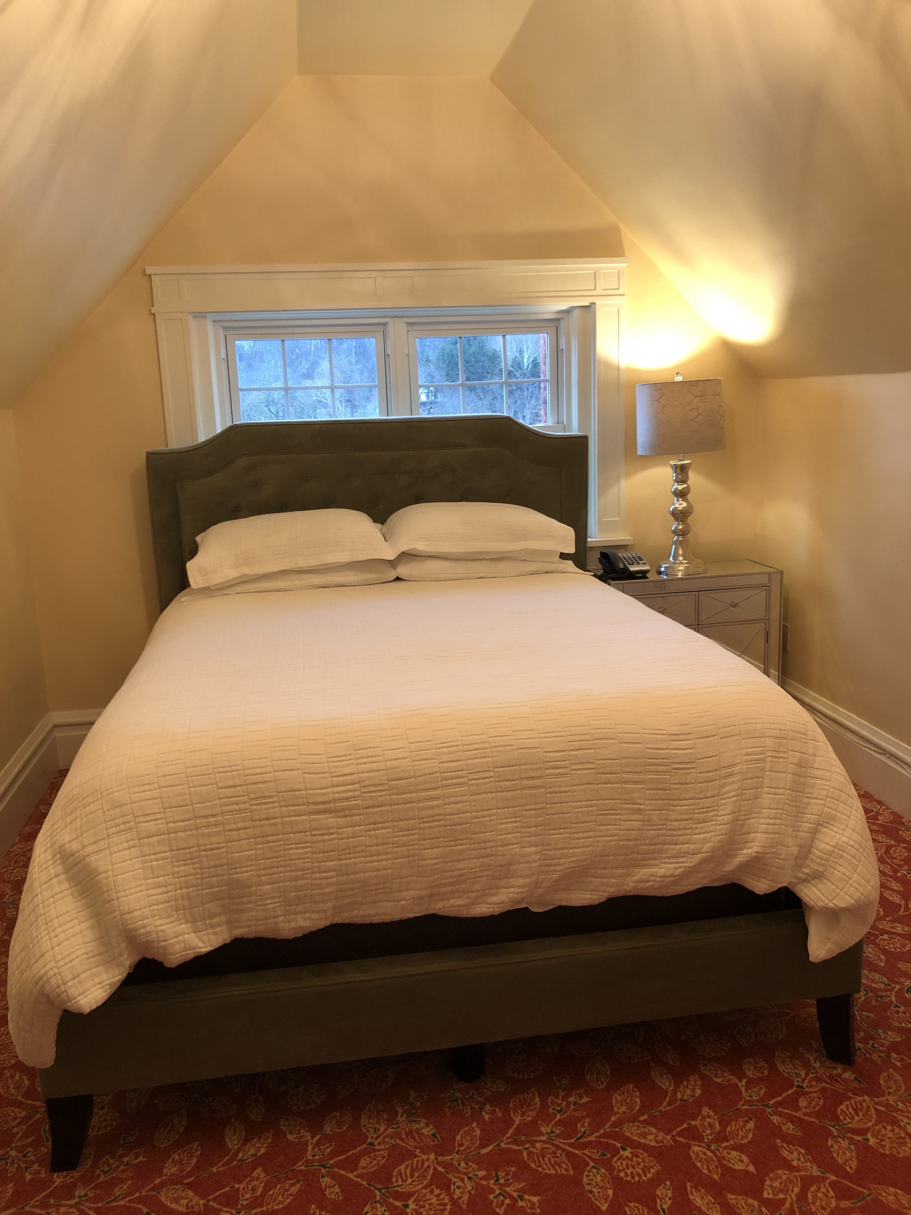 Room 304 is a great, cozy 3rd floor room. The bedroom in is small but uniquely comfortable. Room 303 has a queen bed and a smaller window that casts the night lights gently on the ceiling. The bathroom has beautiful subway tile and a good sized shower. There is also a small sitting room at the entrance of room 304 which has a comfortable recliner and lamp great for a reading or working before bed.